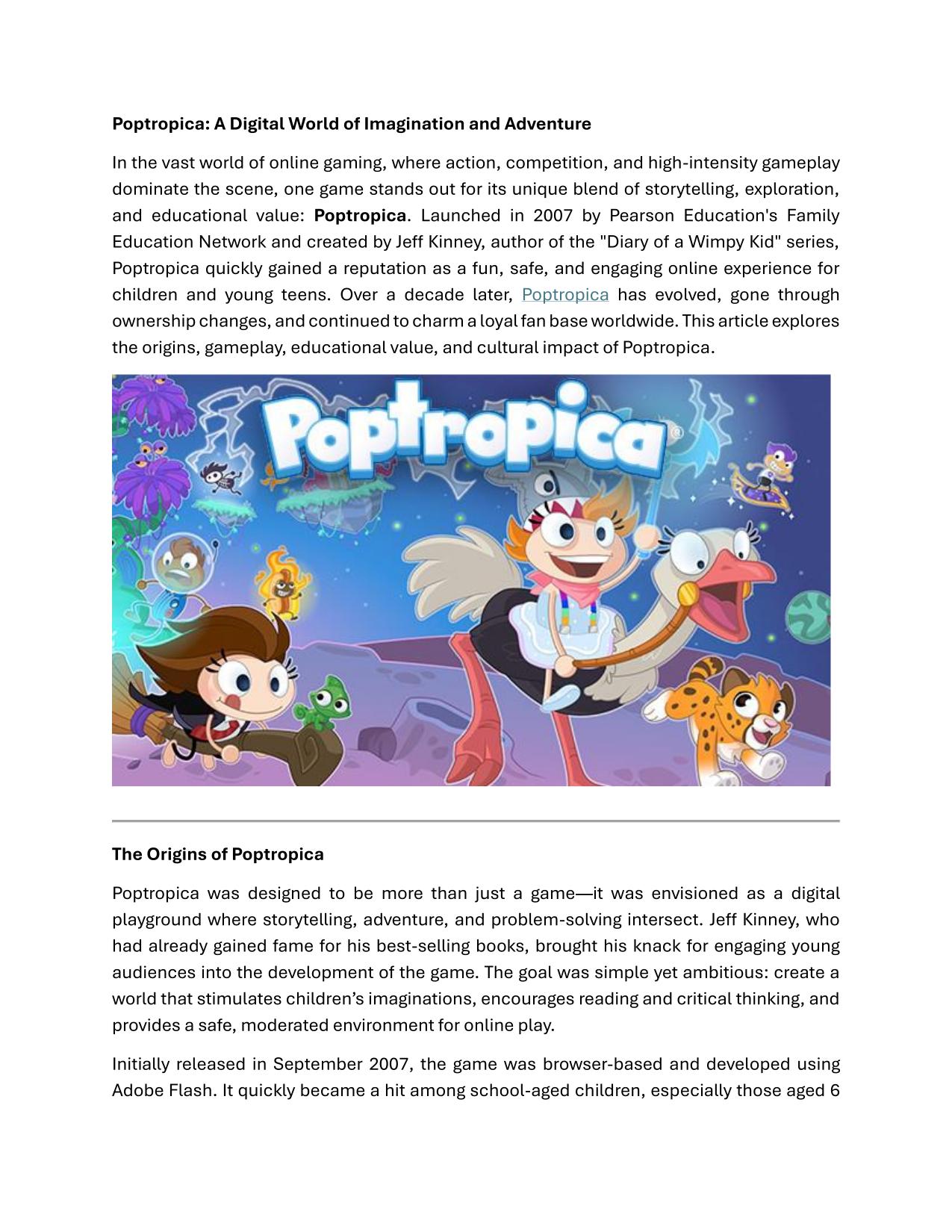 Poptropica is an engaging online adventure game that has captivated children and teens worldwide for over a decade. Launched by Pearson Education in 2007 and developed by the renowned designer Jeff Kinney, the creator of Diary of a Wimpy Kid, Poptropica combines adventure, problem-solving, and creativity in a unique virtual world. Its charm lies in allowing players to explore islands, complete quests, and interact with friends in a safe, moderated environment.