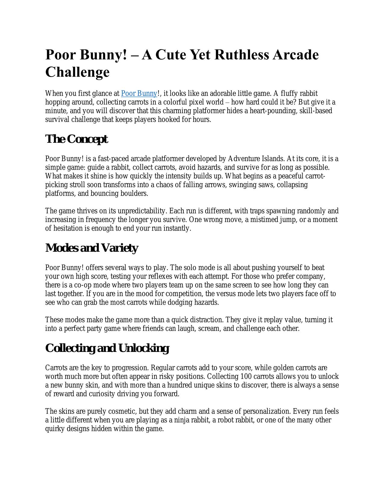 Challenging Trap Combinations: The key to success in Poor Bunny is learning to read trap combinations. Some levels feature overlapping traps that require you to think ahead and plan your movements carefully. Mastering these combinations is a satisfying challenge that adds to the game's depth and keeps players engaged.