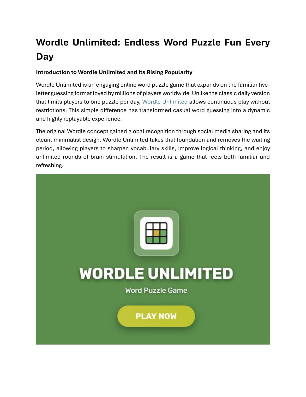 Wordle Unlimited has become a favorite destination for puzzle lovers who crave more than a single daily challenge. Inspired by the global success of Wordle, this expanded version removes the one puzzle per day limit and replaces it with continuous play. The result is a fast, flexible, and highly engaging word guessing experience that appeals to casual players and language enthusiasts alike.